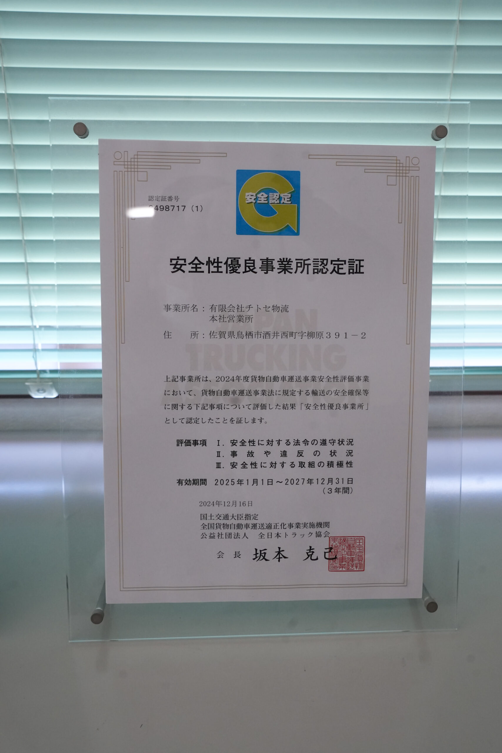 当社では令和6年より貨物自動車運送事業安全性評価事業において、安全性優良事業所と認定されています。